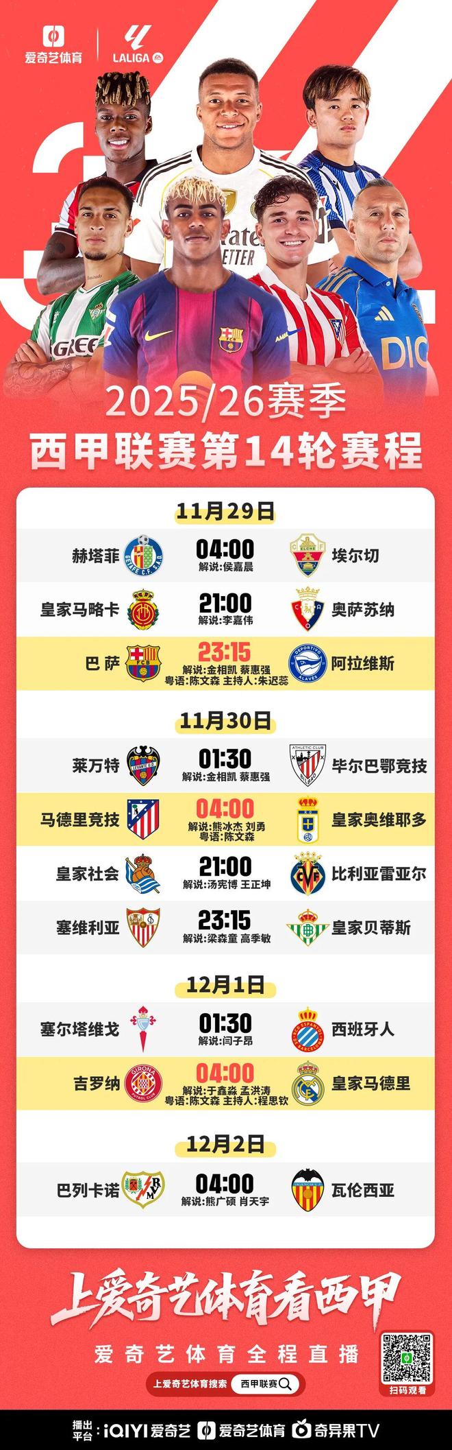 本周六夜间西甲第14轮,巴萨坐镇主场对阵阿拉维斯,由于皇马要稍晚一天比赛,因此巴萨赢球即可暂时登顶。本场比赛,爱奇艺体育将全程直播。